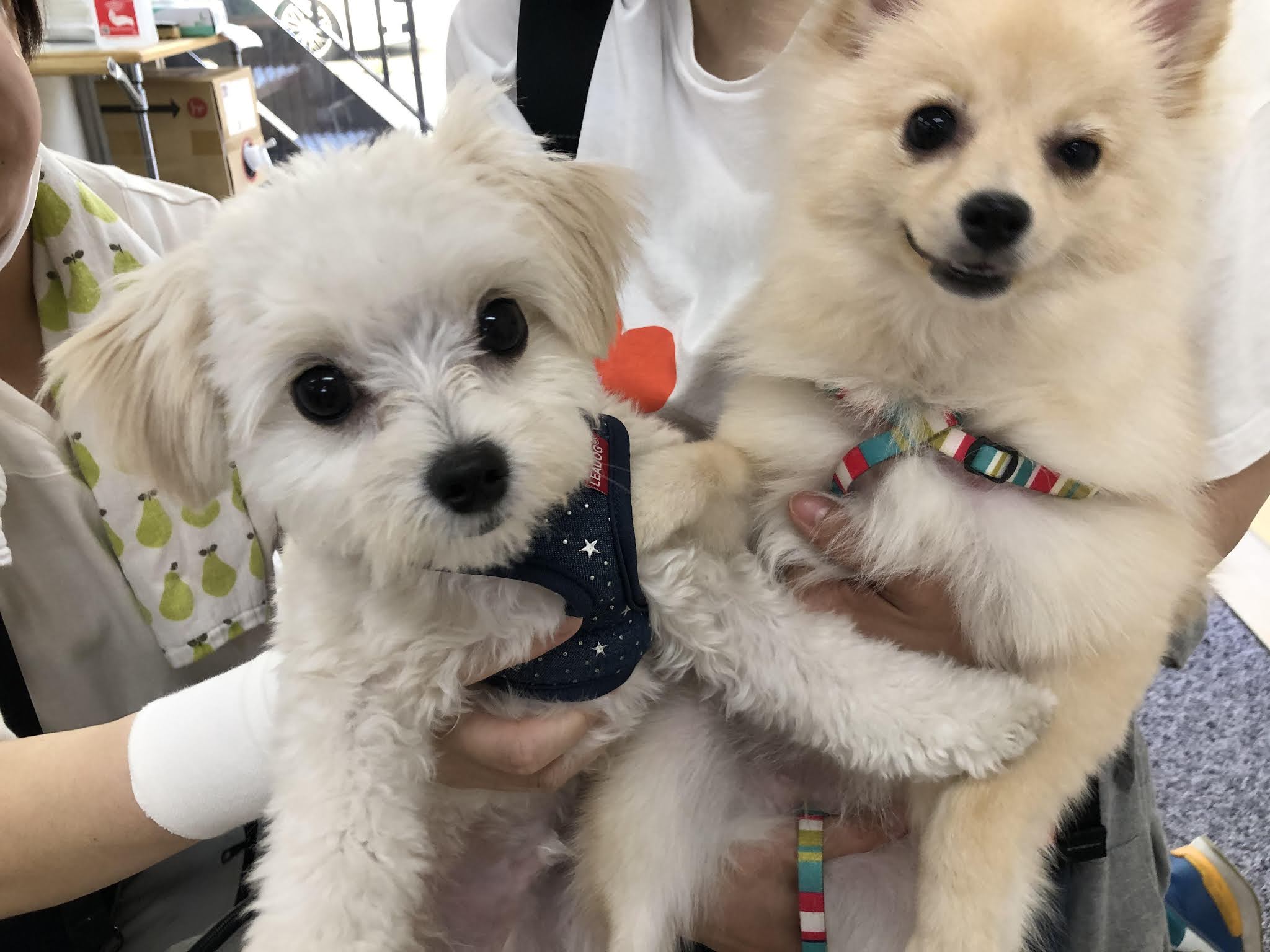 左の子は「大福」ちゃん9か月、マルチーズとチワワのミックス。右の子は「ハル」ちゃん、ポメラニアンで5か月らしいです。これからも事務所では度々来ていただけると思うので、もしたまたまでも会うことがれば是非ともよろしくお願いします。