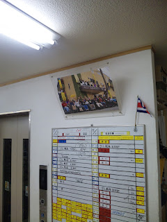 5月8日に事務所前で撮ったスタッフ集合写真を拡大してエレベーター横にかかげました。